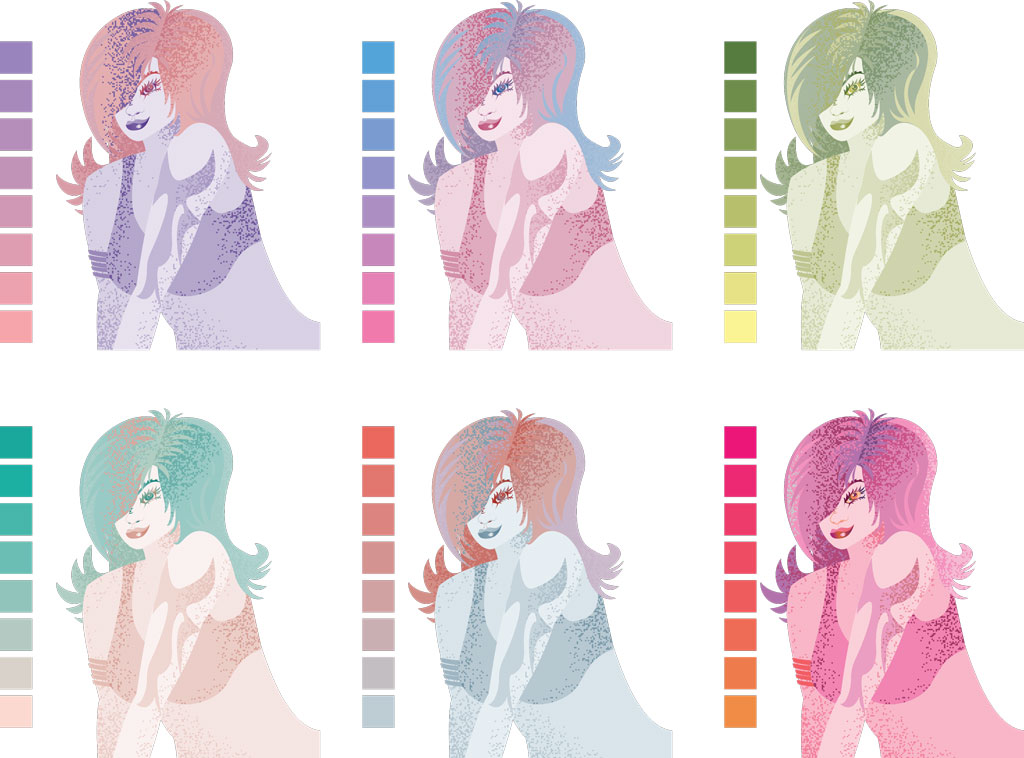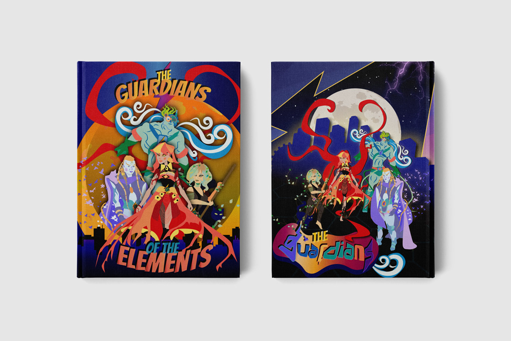 Collection of drawings made in Adobe Illustrator, including portraits of a personality: Bjork (pen tool exercise) as well as a troop of comic book personas (character drawing), based on the four elements: fire, water, earth and air.