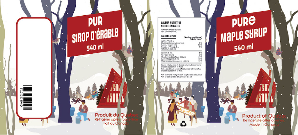 Package design for a fictional, maple syrup company. One is a re-branding of the ol’timey traditional can but with a more inclusive vibe, a new and improved representation of a modern sugar shack scene for today. The second is a clean, flat design representing the very sweet and joyful act of sharing hot taffy on the snow.